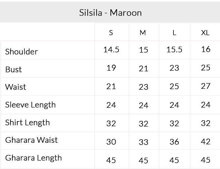 Silsia, A rich maroon self-fabric shirt, beautifully detailed with ornate borders on the neckline, hem, and sleeves, accentuated with delicate adda work for a handcrafted allure. It is paired with a white printed cambric gharara, highlighted with a contrasting border along the sides, creating a striking balance of tradition and grace—perfect for festive and semi-formal occasions.